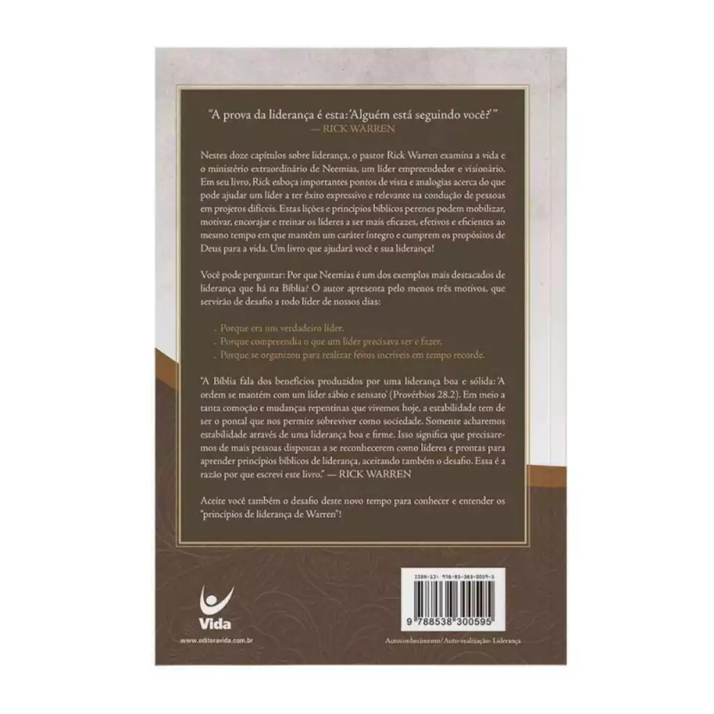 Neemias é um dos exemplos mais destacados de liderança que há na Bíblia, porque era um verdadeiro líder, porque compreendia o que um líder precisava ser e fazer e porque se organizou para realizar feitos incríveis em tempo recorde. Nos doze capítulos sobre liderança, Rick Warren examina a vida e o ministério extraordinário de Neemias, um líder empreendedor e visionário. O livro traz importantes pontos de vista e analogias acerca do que pode ajudar um líder a ter êxito expressivo e relevante na condução das pessoas por projetos difíceis. As lições e os princípios bíblicos perenes podem mobilizar, motivar, encorajar e treinar os líderes a serem mais eficazes, efetivos e eficientes, enquanto mantêm um caráter íntegro e cumprem os propósitos de Deus. O livro ajudará você e sua liderança!