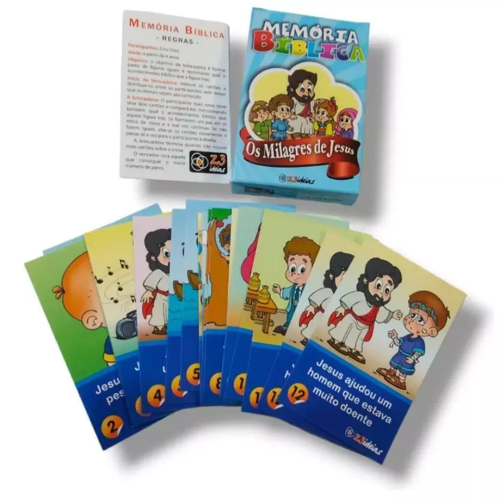 O objetivo da brincadeira é formar pares de figuras iguais e reconhecer qual o acontecimento bíblico que a figura traz.